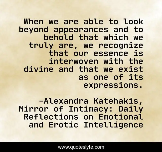 This page presents the quote "When we are able to look beyond appearances and to behold that which we truly are, we recognize that our essence is interwoven with the divine and that we exist as one of its expressions.". Author of this quote is Alexandra Katehakis, Mirror of Intimacy: Daily Reflections on Emotional and Erotic Intelligence. This quote is about essence, appearances, divine, vision,.