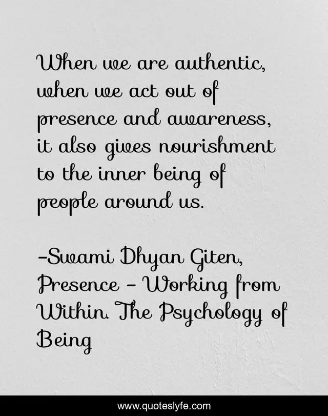 This page presents the quote "When we are authentic, when we act out of presence and awareness, it also gives nourishment to the inner being of people around us.". Author of this quote is Swami Dhyan Giten, Presence - Working from Within. The Psychology of Being. This quote is about psychology, presence, working-with-people, spirituality, meditation, awareness,.