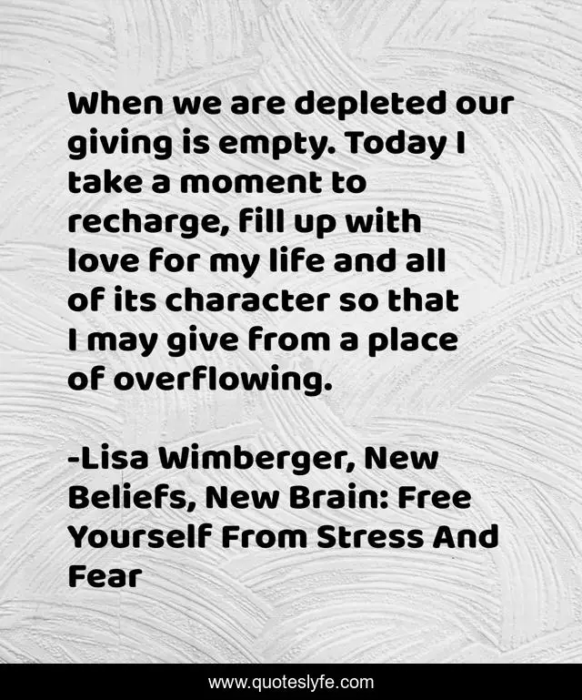 This page presents the quote "When we are depleted our giving is empty. Today I take a moment to recharge, fill up with love for my life and all of its character so that I may give from a place of overflowing.". Author of this quote is Lisa Wimberger, New Beliefs, New Brain: Free Yourself From Stress And Fear. This quote is about spiritual-growth, mindfulness, inspirational, neuroplasticity, enthusiasm,.