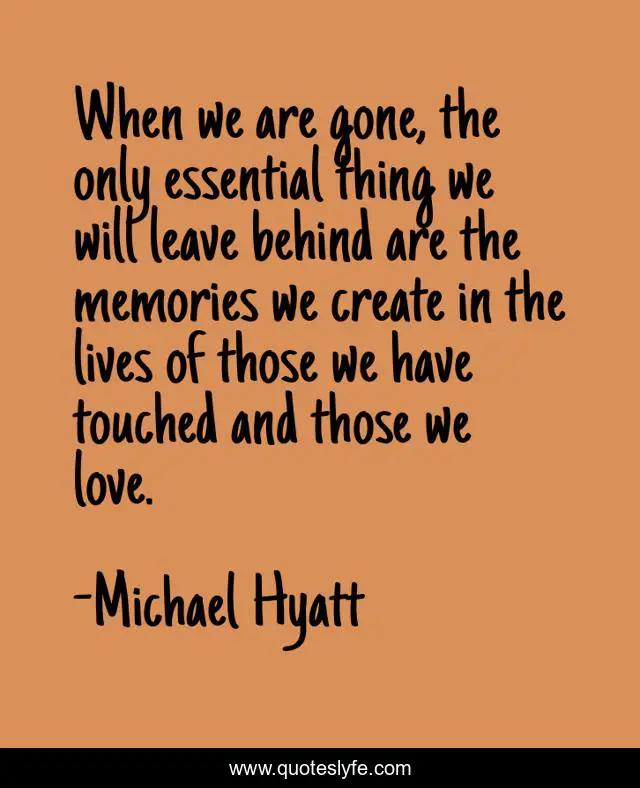 This page presents the quote "When we are gone, the only essential thing we will leave behind are the memories we create in the lives of those we have touched and those we love.". Author of this quote is Michael Hyatt. This quote is about personal-development, memories, legacy, intentional-living, life-plan,.