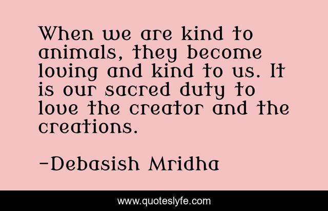 This page presents the quote "When we are kind to animals, they become loving and kind to us. It is our sacred duty to love the creator and the creations.". Author of this quote is Debasish Mridha. This quote is about sacred-duty, creator-and-the-creations, philosophy, debasish-mridha, quotes, inspirational, enthusiasm, be-kind-to-animals, loving-animals,.