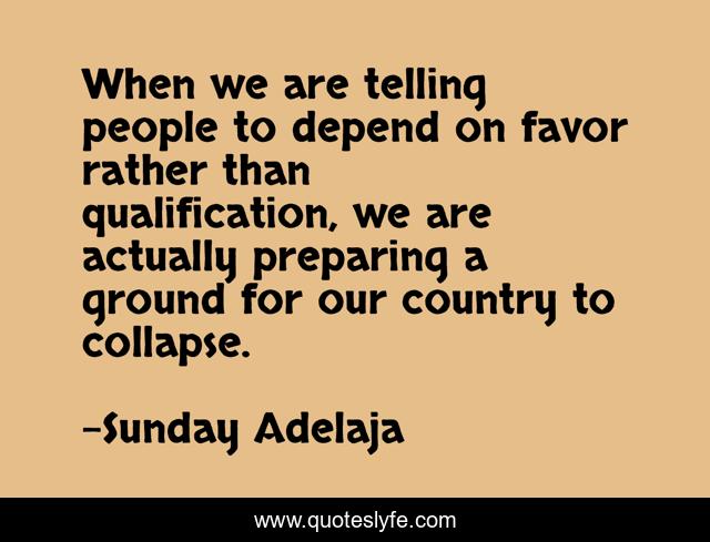 This page presents the quote "When we are telling people to depend on favor rather than qualification, we are actually preparing a ground for our country to collapse.". Author of this quote is Sunday Adelaja. This quote is about collapse, depending, country, people, qualifications, favour, preparation,.