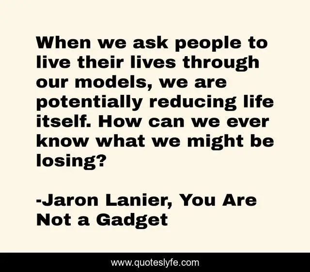 This page presents the quote "When we ask people to live their lives through our models, we are potentially reducing life itself. How can we ever know what we might be losing?". Author of this quote is Jaron Lanier, You Are Not a Gadget. This quote is about ethics, tech, life,.