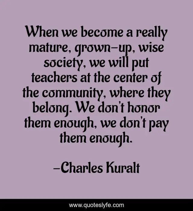 This page presents the quote "When we become a really mature, grown-up, wise society, we will put teachers at the center of the community, where they belong. We don't honor them enough, we don't pay them enough.". Author of this quote is Charles Kuralt. This quote is about society, wise, community,.