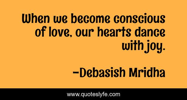This page presents the quote "When we become conscious of love, our hearts dance with joy.". Author of this quote is Debasish Mridha. This quote is about love, conscious-of-love, hearts-dance-with-joy, philosophy, debasish-mridha, quotes, inspirational, enthusiasm, debasish-mridha-m-d,.