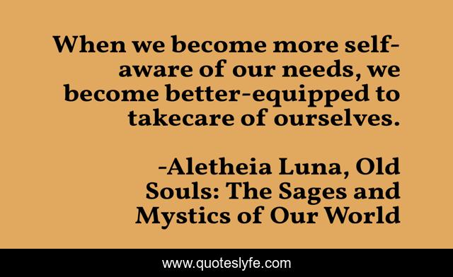 This page presents the quote "When we become more self-aware of our needs, we become better-equipped to takecare of ourselves.". Author of this quote is Aletheia Luna, Old Souls: The Sages and Mystics of Our World. This quote is about self-love, honesty, truth, authenticity, self-aware, awareness,.
