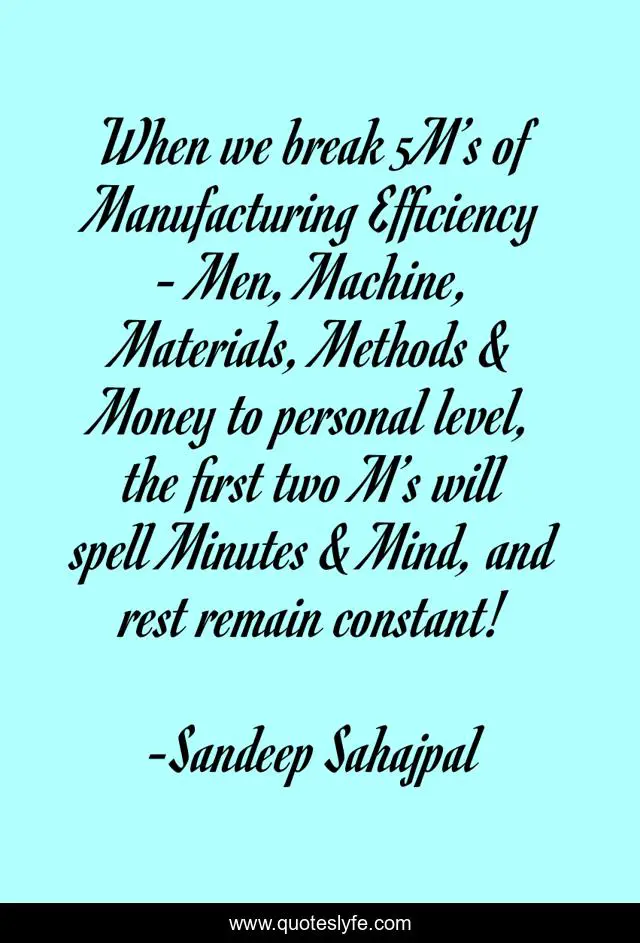 This page presents the quote "When we break 5M’s of Manufacturing Efficiency - Men, Machine, Materials, Methods & Money to personal level, the first two M’s will spell Minutes & Mind, and rest remain constant!". Author of this quote is Sandeep Sahajpal. This quote is about men, money, material, mind, machine, efficiency, time, method,.