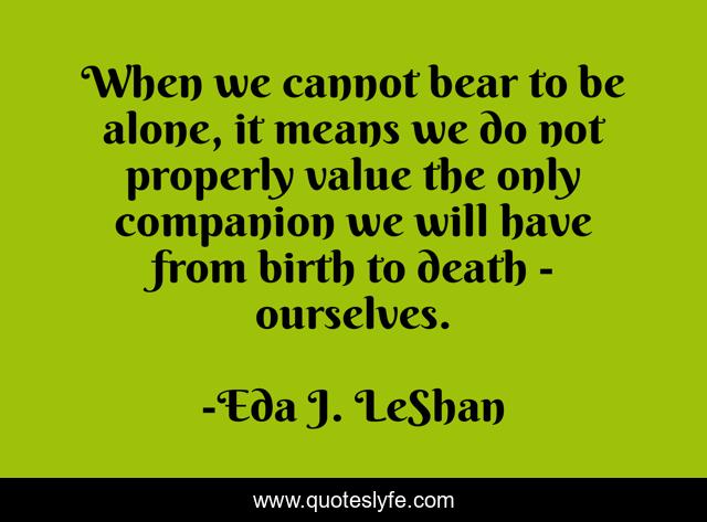 This page presents the quote "When we cannot bear to be alone, it means we do not properly value the only companion we will have from birth to death - ourselves.". Author of this quote is Eda J. LeShan. This quote is about life, values, loneliness, companionship,.