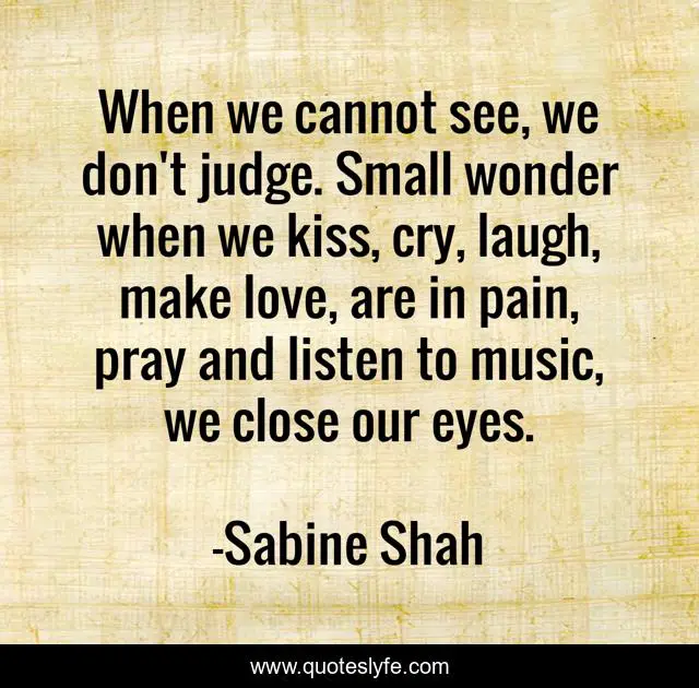 This page presents the quote "When we cannot see, we don't judge. Small wonder when we kiss, cry, laugh, make love, are in pain, pray and listen to music, we close our eyes.". Author of this quote is Sabine Shah. This quote is about judge, love, music, affection, pray,.