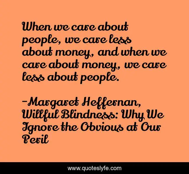 This page presents the quote "When we care about people, we care less about money, and when we care about money, we care less about people.". Author of this quote is Margaret Heffernan, Willful Blindness: Why We Ignore the Obvious at Our Peril. .