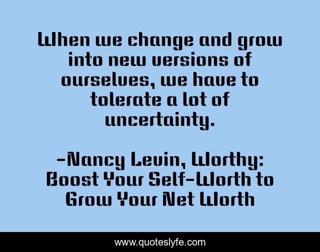 This page presents the quote "When we change and grow into new versions of ourselves, we have to tolerate a lot of uncertainty.". Author of this quote is Nancy Levin, Worthy: Boost Your Self-Worth to Grow Your Net Worth. This quote is about evolution, nancy-levin, self-worth, uncertainty,.