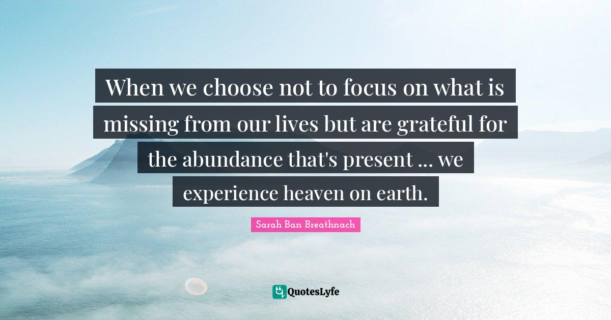 This page presents the quote "When we choose not to focus on what is missing from our lives but are grateful for the abundance that's present ... we experience heaven on earth.". Author of this quote is Sarah Ban Breathnach. This quote is about gratitude, missing, focus, abundance, grateful, our lives, heaven on earth, experience,.