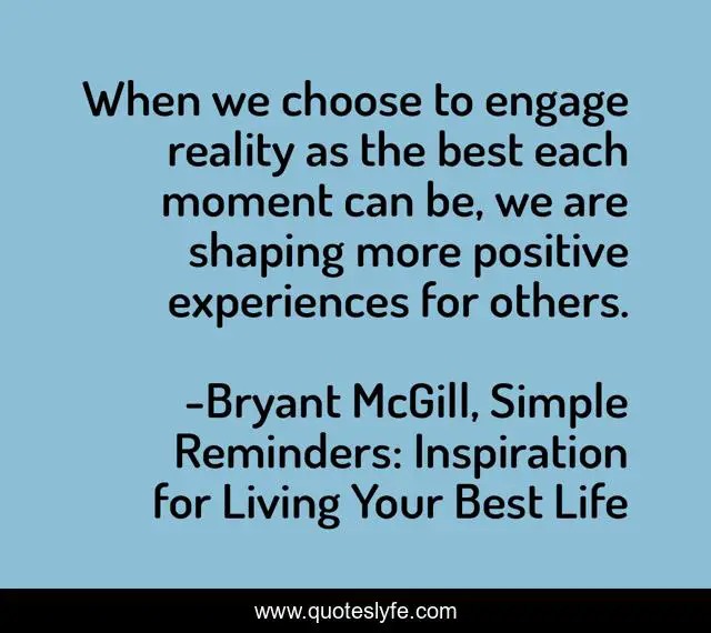 This page presents the quote "When we choose to engage reality as the best each moment can be, we are shaping more positive experiences for others.". Author of this quote is Bryant McGill, Simple Reminders: Inspiration for Living Your Best Life. This quote is about positivity, engagement, experience, choices, reality, shaping, momentary,.