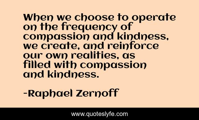 This page presents the quote "When we choose to operate on the frequency of compassion and kindness, we create, and reinforce our own realities, as filled with compassion and kindness.". Author of this quote is Raphael Zernoff. This quote is about kindness, self-awareness, consciousness, compassion, reality, self-realisation, manifestation, wisdom,.