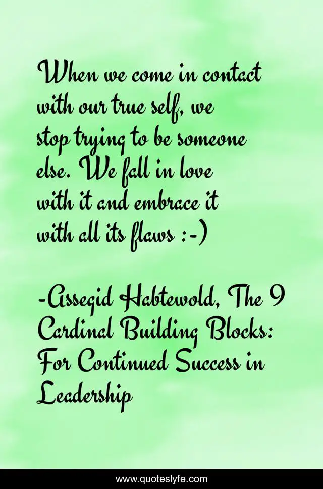 This page presents the quote "When we come in contact with our true self, we stop trying to be someone else. We fall in love with it and embrace it with all its flaws :-)". Author of this quote is Assegid Habtewold, The 9 Cardinal Building Blocks: For Continued Success in Leadership. This quote is about be-yourself, embrace, true-self, love, affection,.
