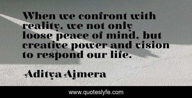 This page presents the quote "When we confront with reality, we not only loose peace of mind, but creative power and vision to respond our life.". Author of this quote is Aditya Ajmera. This quote is about peace-of-mind, life, reality-of-life, confrontation, wisdom,.