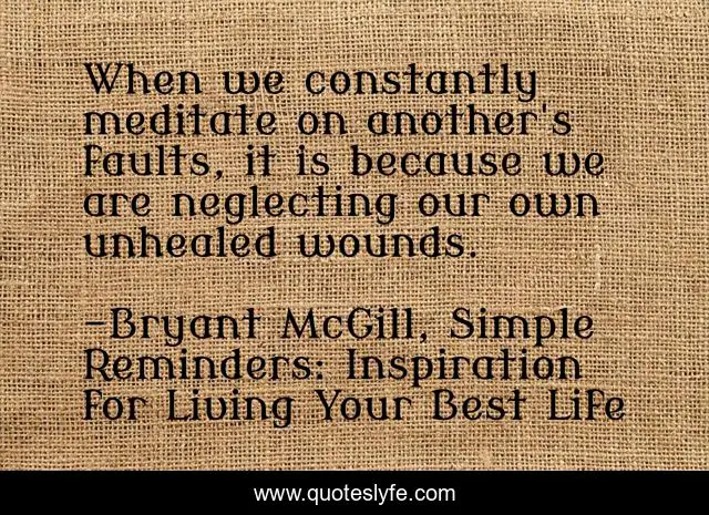 This page presents the quote "When we constantly meditate on another's faults, it is because we are neglecting our own unhealed wounds.". Author of this quote is Bryant McGill, Simple Reminders: Inspiration for Living Your Best Life. This quote is about unhealed, spirituality, meditation, focus, neglect,.