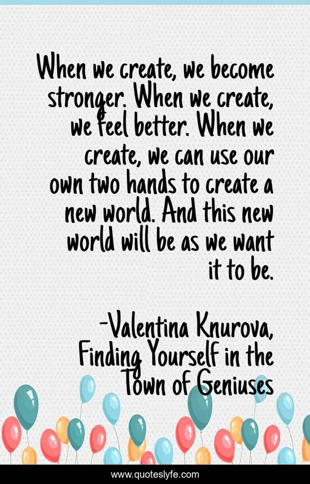 This page presents the quote "When we create, we become stronger. When we create, we feel better. When we create, we can use our own two hands to create a new world. And this new world will be as we want it to be.". Author of this quote is Valentina Knurova, Finding Yourself in the Town of Geniuses. This quote is about literature, art, biographies, fiction, music, history,.
