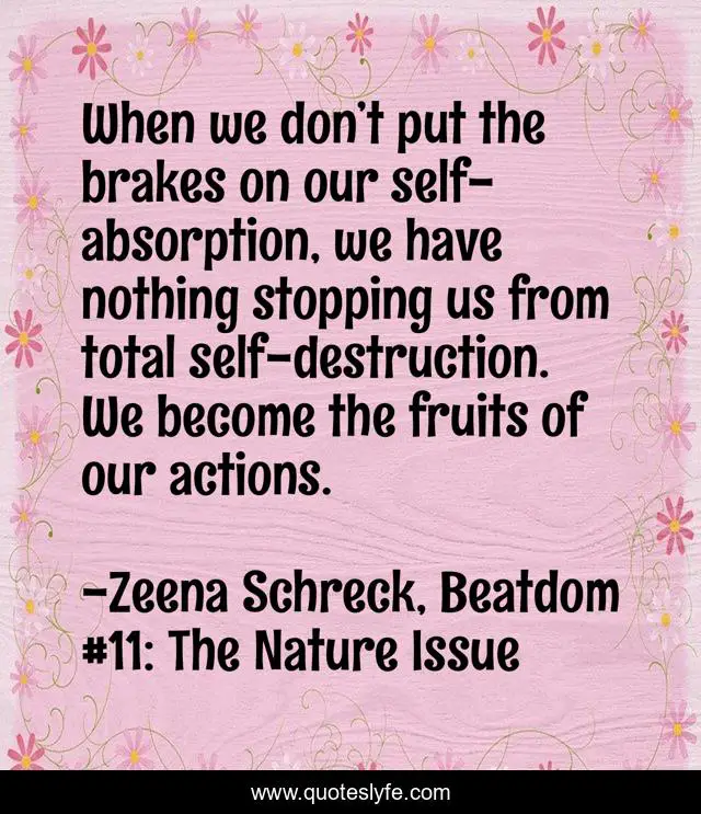 This page presents the quote "When we don’t put the brakes on our self-absorption, we have nothing stopping us from total self-destruction. We become the fruits of our actions.". Author of this quote is Zeena Schreck, Beatdom #11: The Nature Issue. This quote is about karmic-effects, self-destruction, beatdom, hubris, egocentricity, karma, selfishness, zeena-schreck, self-absorption,.