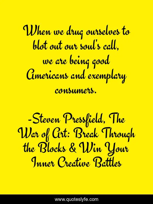 This page presents the quote "When we drug ourselves to blot out our soul's call, we are being good Americans and exemplary consumers.". Author of this quote is Steven Pressfield, The War of Art: Break Through the Blocks & Win Your Inner Creative Battles. This quote is about consumerism, art, destiny, creativity, soul, america,.