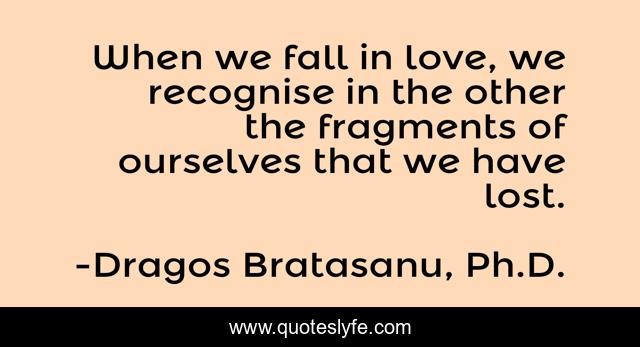 This page presents the quote "When we fall in love, we recognise in the other the fragments of ourselves that we have lost.". Author of this quote is Dragos Bratasanu, Ph.D.. This quote is about relationships, true-love, life, falling-in-love, love, partnership, soul, find-yourself, affection,.