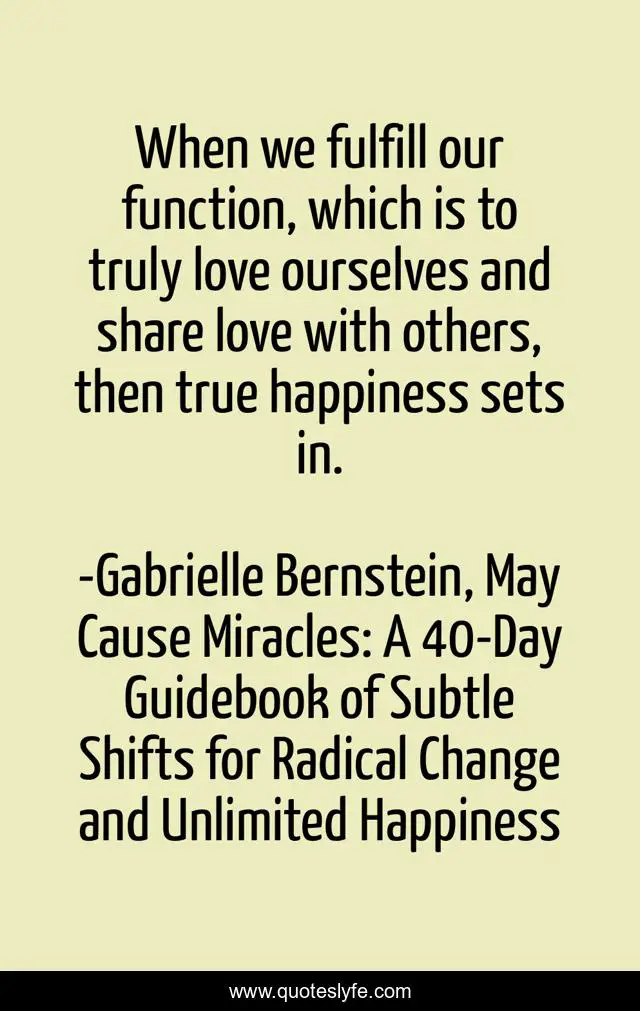 This page presents the quote "When we fulfill our function, which is to truly love ourselves and share love with others, then true happiness sets in.". Author of this quote is Gabrielle Bernstein, May Cause Miracles: A 40-Day Guidebook of Subtle Shifts for Radical Change and Unlimited Happiness. This quote is about sharing-love, self-love, purpose, happiness,.