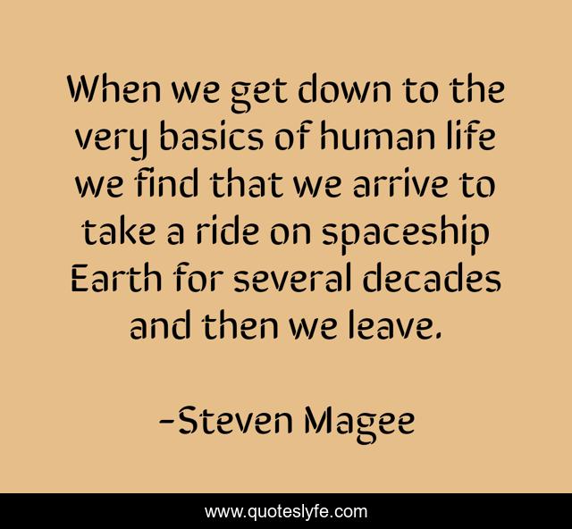 This page presents the quote "When we get down to the very basics of human life we find that we arrive to take a ride on spaceship Earth for several decades and then we leave.". Author of this quote is Steven Magee. This quote is about down, life, basics, get, very, ride, space, we, find,.