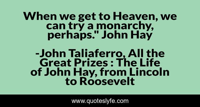 This page presents the quote "When we get to Heaven, we can try a monarchy, perhaps." John Hay". Author of this quote is John Taliaferro, All the Great Prizes : The Life of John Hay, from Lincoln to Roosevelt. This quote is about skepticism, discipleship, church-and-state, realism, depravity,.