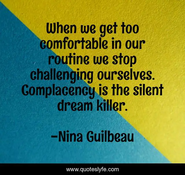 This page presents the quote "When we get too comfortable in our routine we stop challenging ourselves. Complacency is the silent dream killer.". Author of this quote is Nina Guilbeau. This quote is about reach-your-destiny, change-your-life, wisdom, reach-your-goals, self-improvement, change,.