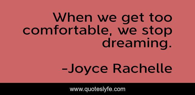 This page presents the quote "When we get too comfortable, we stop dreaming.". Author of this quote is Joyce Rachelle. This quote is about ambitions, comfort, discomfort, comfortable, comfort-zone, too-comfortable, dreaming, hopes, finding-your-passion,.