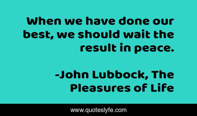 This page presents the quote "When we have done our best, we should wait the result in peace.". Author of this quote is John Lubbock, The Pleasures of Life. This quote is about confidence, peace, positive, advice, motivational, result, inspirational, enthusiasm, best,.