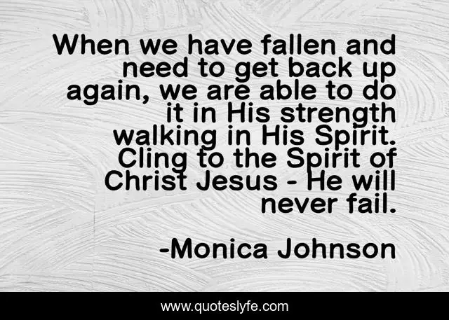 This page presents the quote "When we have fallen and need to get back up again, we are able to do it in His strength walking in His Spirit. Cling to the Spirit of Christ Jesus - He will never fail.". Author of this quote is Monica Johnson. This quote is about fail, walking, back up,.
