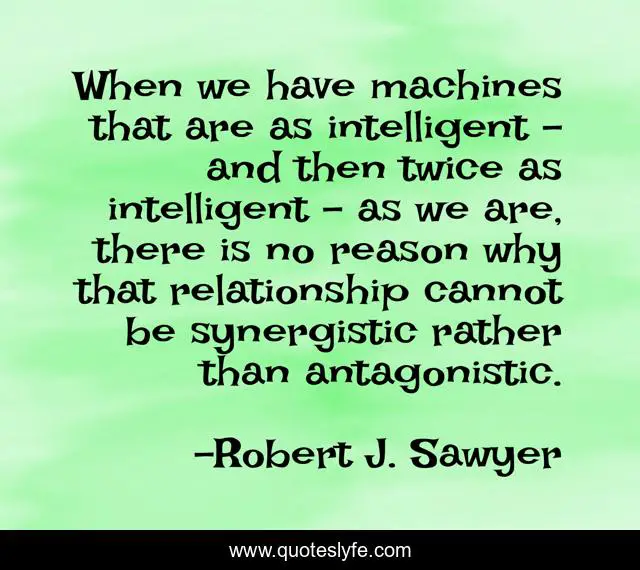 This page presents the quote "When we have machines that are as intelligent - and then twice as intelligent - as we are, there is no reason why that relationship cannot be synergistic rather than antagonistic.". Author of this quote is Robert J. Sawyer. This quote is about reason, intelligent, why,.