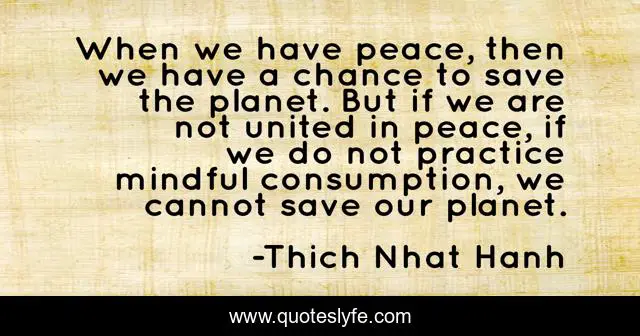 This page presents the quote "When we have peace, then we have a chance to save the planet. But if we are not united in peace, if we do not practice mindful consumption, we cannot save our planet.". Author of this quote is Thich Nhat Hanh. This quote is about practice, peace, consumption,.