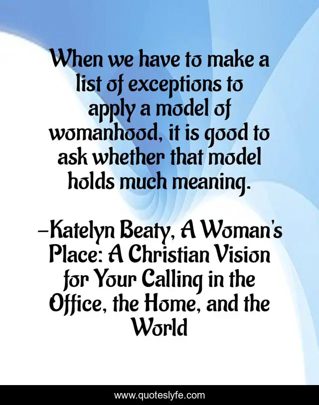 This page presents the quote "When we have to make a list of exceptions to apply a model of womanhood, it is good to ask whether that model holds much meaning.". Author of this quote is Katelyn Beaty, A Woman's Place: A Christian Vision for Your Calling in the Office, the Home, and the World. This quote is about work, working-women, gender-roles,.