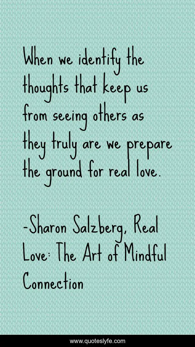 This page presents the quote "When we identify the thoughts that keep us from seeing others as they truly are we prepare the ground for real love.". Author of this quote is Sharon Salzberg, Real Love: The Art of Mindful Connection. This quote is about love, meditation, real-love, affection, mindfulness,.