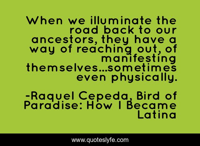 This page presents the quote "When we illuminate the road back to our ancestors, they have a way of reaching out, of manifesting themselves...sometimes even physically.". Author of this quote is Raquel Cepeda, Bird of Paradise: How I Became Latina. This quote is about life, ancestors, mythos, journey-in-life, spirituality, journey, inspirational, manifestation, enthusiasm,.