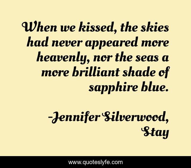 This page presents the quote "When we kissed, the skies had never appeared more heavenly, nor the seas a more brilliant shade of sapphire blue.". Author of this quote is Jennifer Silverwood, Stay. This quote is about romance, paranormal, mythical-romance, myth, stay,.