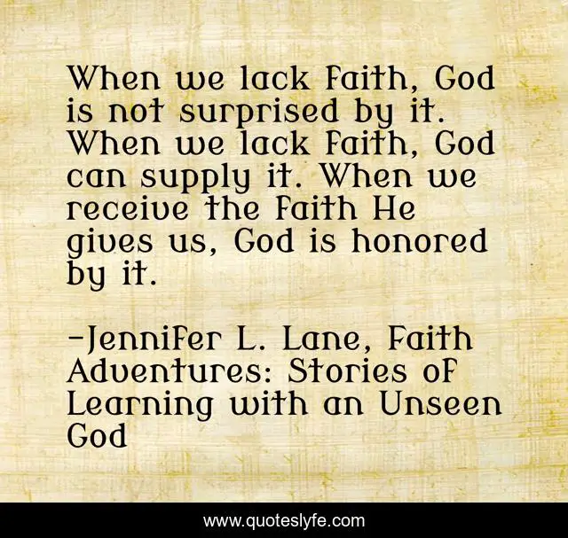 This page presents the quote "When we lack faith, God is not surprised by it. When we lack faith, God can supply it. When we receive the faith He gives us, God is honored by it.". Author of this quote is Jennifer L. Lane, Faith Adventures: Stories of Learning with an Unseen God. This quote is about faith, christian-life, faith-adventures, faith-in-god,.