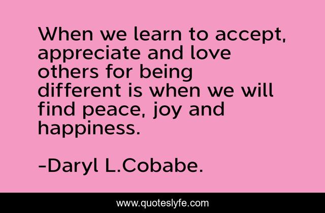 This page presents the quote "When we learn to accept, appreciate and love others for being different is when we will find peace, joy and happiness.". Author of this quote is Daryl L.Cobabe.. This quote is about inspirational-life, inspirational-religious,.