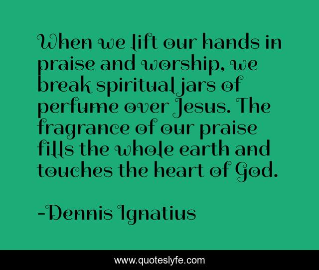 This page presents the quote "When we lift our hands in praise and worship, we break spiritual jars of perfume over Jesus. The fragrance of our praise fills the whole earth and touches the heart of God.". Author of this quote is Dennis Ignatius. This quote is about god, worship-leading, fragrance, joy, worship, praise-and-worship,.