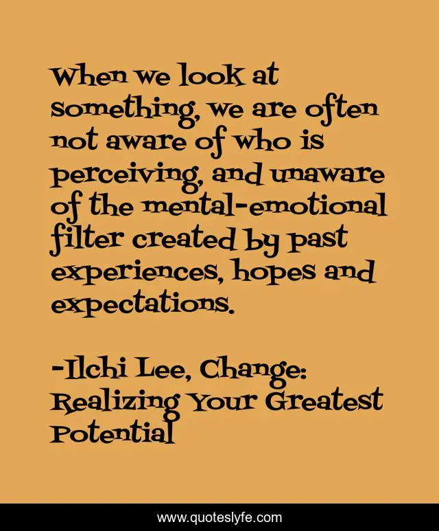 This page presents the quote "When we look at something, we are often not aware of who is perceiving, and unaware of the mental-emotional filter created by past experiences, hopes and expectations.". Author of this quote is Ilchi Lee, Change: Realizing Your Greatest Potential. This quote is about enthusiasm, inspirational, self-development,.