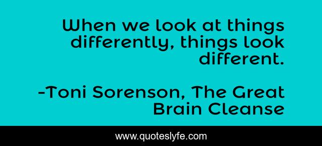 This page presents the quote "When we look at things differently, things look different.". Author of this quote is Toni Sorenson, The Great Brain Cleanse. This quote is about life, change, brain, perspective, difference, thoughts,.