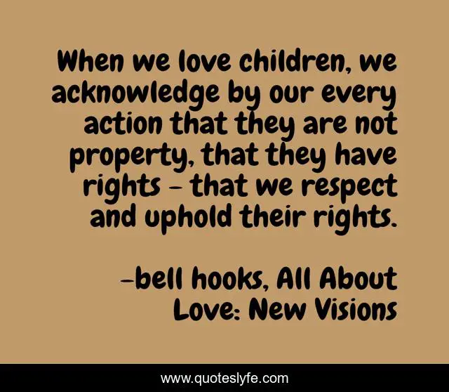 This page presents the quote "When we love children, we acknowledge by our every action that they are not property, that they have rights - that we respect and uphold their rights.". Author of this quote is bell hooks, All About Love: New Visions. This quote is about civil-rights-of-children, love, all-about-love, parenting, bell-hooks, children, affection,.