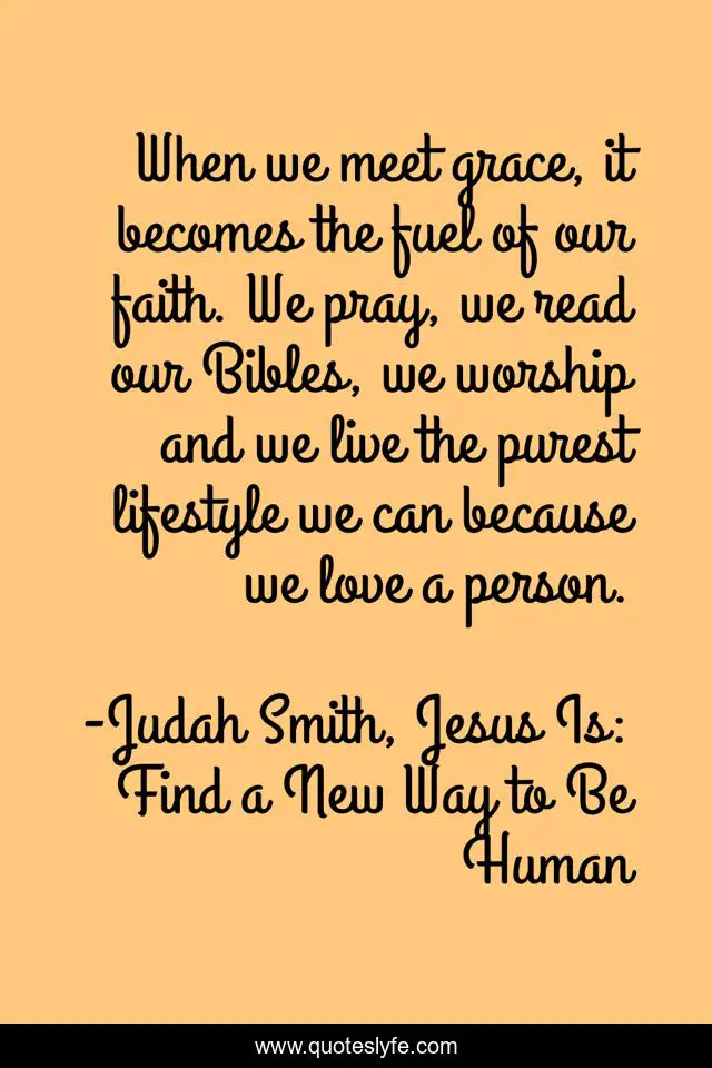 This page presents the quote "When we meet grace, it becomes the fuel of our faith. We pray, we read our Bibles, we worship and we live the purest lifestyle we can because we love a person.". Author of this quote is Judah Smith, Jesus Is: Find a New Way to Be Human. This quote is about enthusiasm, inspirational, grace, truth, jesus,.