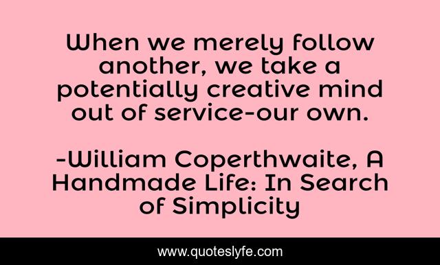 This page presents the quote "When we merely follow another, we take a potentially creative mind out of service-our own.". Author of this quote is William Coperthwaite, A Handmade Life: In Search of Simplicity. This quote is about enthusiasm, philosophical, inspirational,.
