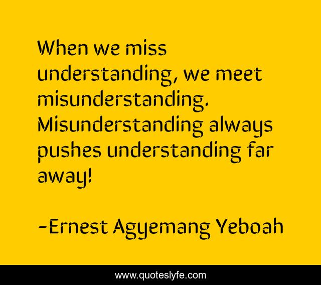 This page presents the quote "When we miss understanding, we meet misunderstanding. Misunderstanding always pushes understanding far away!". Author of this quote is Ernest Agyemang Yeboah. This quote is about confusion, hatred, misunderstandings, issues, conflict-in-love,.