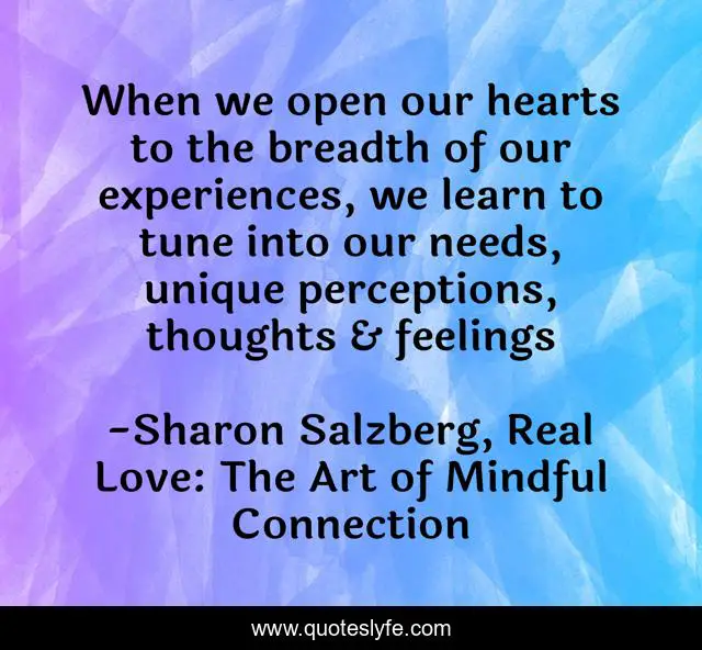 This page presents the quote "When we open our hearts to the breadth of our experiences, we learn to tune into our needs, unique perceptions, thoughts & feelings". Author of this quote is Sharon Salzberg, Real Love: The Art of Mindful Connection. This quote is about heart, sensitivity, perception, real-love, wisdom,.