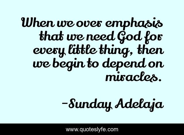 This page presents the quote "When we over emphasis that we need God for every little thing, then we begin to depend on miracles.". Author of this quote is Sunday Adelaja. This quote is about miracles, emphasis, godly, depending,.