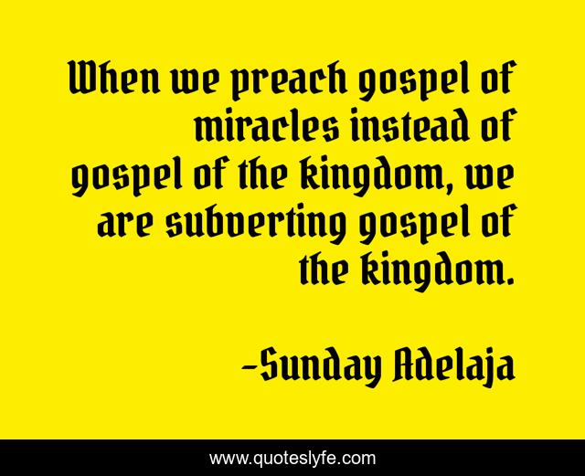 This page presents the quote "When we preach gospel of miracles instead of gospel of the kingdom, we are subverting gospel of the kingdom.". Author of this quote is Sunday Adelaja. This quote is about kingdom, miracles, gospel, miracle, preaching,.